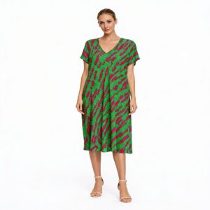 Canlı renkleri ve rahat kesimi ile yaz aylarında hem şık hem konforlu bir kullanım sunan desenli elbise modelidir. Günlük kullanım, tatil ve yaz kombinleri için ideal bir parçadır.