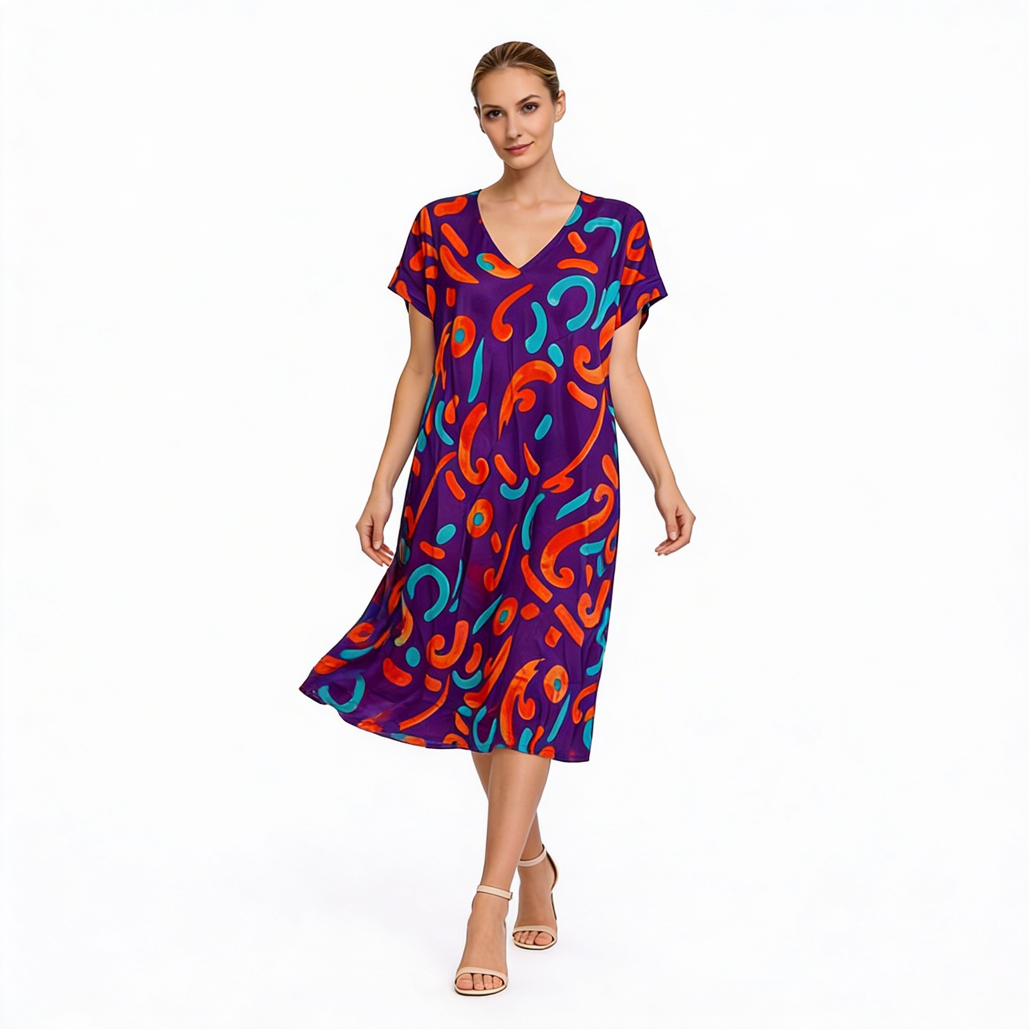 Ana Sayfa Uncategorized Mor Desenli V Yaka Rahat Kesim Kadın Elbise